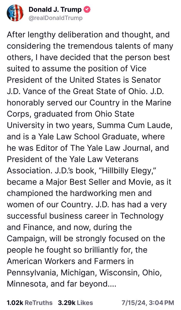 Why am I bringing this up? Because it is relevant to J.D. Vance and his selection as Trump’s Vice-Presidential running mate. I will reference this conversation further down the line in this reflection. As for you, valued reader, this is food for thought and I don’t expect you all to like my views on this selection, nor do I demand you march along in lockstep and hold your opinions back. I do, however, ask that your opinions be grounded in fact and not in hearsay from the Internet.