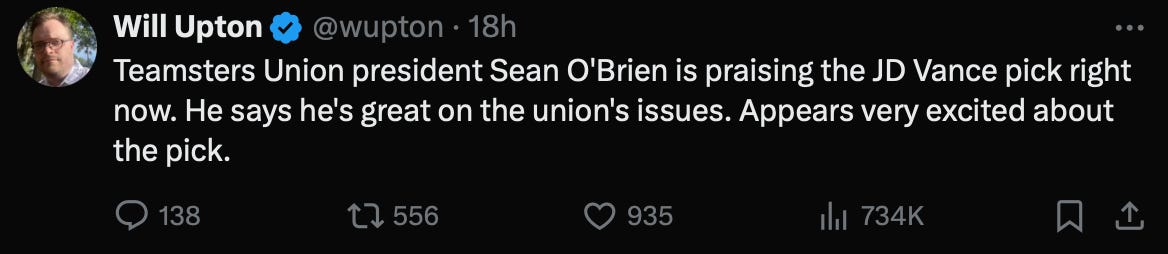 The good news here is that Trump clearly thinks he is sitting on 262 or 268 electoral votes depending on if Nevada is winnable or not, a tally that includes North Carolina, Georgia, and Arizona. That means any one of Pennsylvania, Michigan, or Wisconsin would put Trump over the top. Trump believing he has Arizona, Georgia, and Nevada accounted for, with Vance brought in to help reel in any of the big three in the Industrial/Upper Midwest, addresses all of the decisive states except for New Hampshire, which factors into the long shot Trump victory scenarios that are not likely to occur. My first point for what a V.P. nominee must be is addressed here, and there aren’t many, if any, other major political names out there that may potentially sway those 44 key electoral votes in the target states. Trump clearly believes Vance appeals to “workers and farmers,” and Sean O’Brien apparently thinks he’s got what it takes to shred what remains of the white-working class Union Democrat vote in places Biden needs it most.