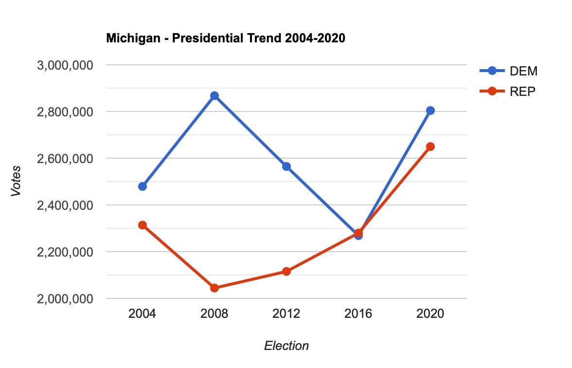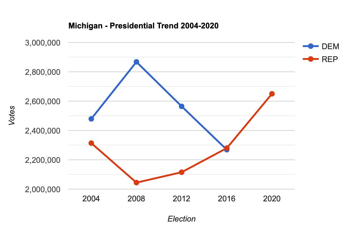 Michigan is not a state with many “horse race” counties, which have a massive influx of transplants that would give reasonable cause for both parties to experience substantial gains; therefore, as the white working class leaves the Democrat Party, that column of votes tends to crater, and the gaps close even faster if those disaffected individuals make a complete reversal and start supporting Republicans.