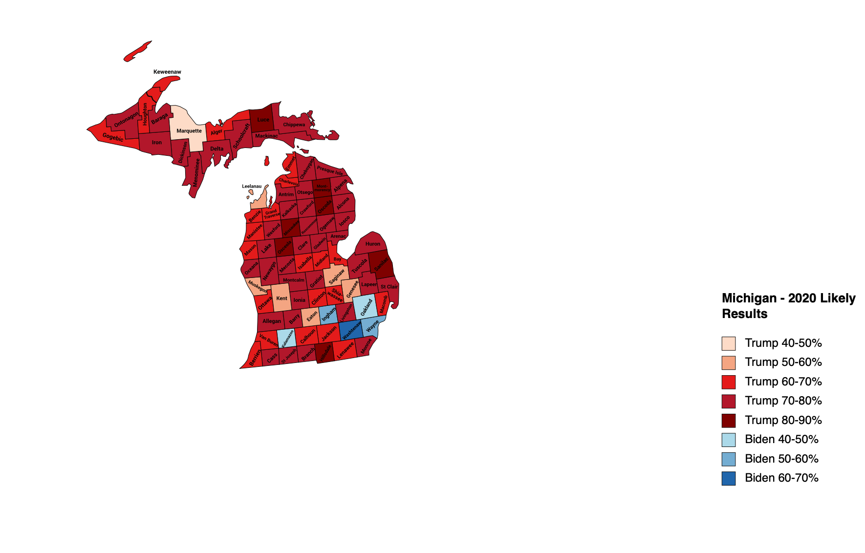 In this likely map of Michigan, Trump holds Kent, Saginaw, and Leelanau Counties, flips Marquette, Muskegon, and Genesee Counties, and barely loses Oakland and Kalamazoo Counties, while dramatically tightening the Democrat margin in Wayne County.