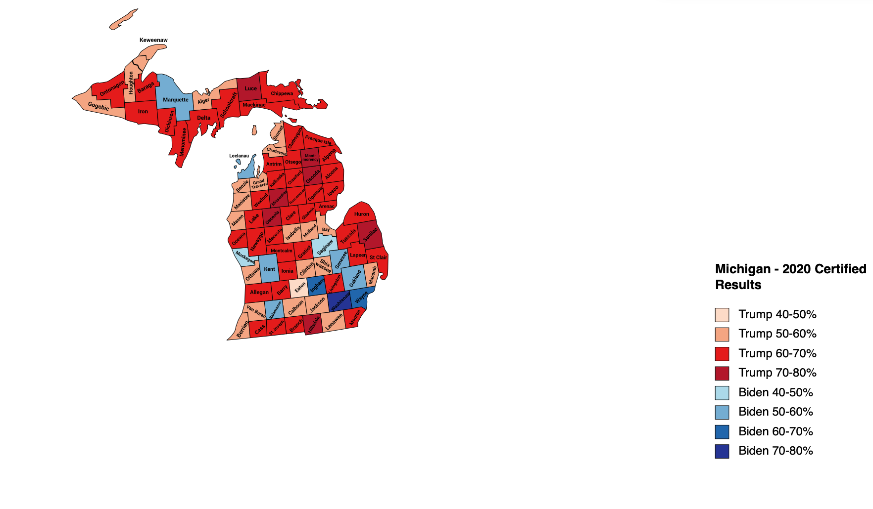 Here is the certified results map for Michigan, showing county level margins in what comprised a “154,000 vote victory” for Biden.