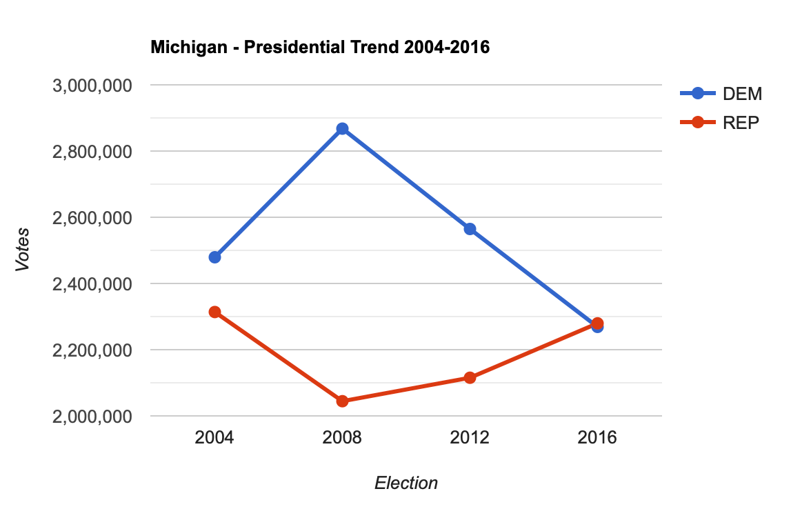 The chart above shows a close race, within 200,000 votes, between Bush and Kerry. Republicans run stronger in reelection historically in the Industrial Midwest, but that wasn’t enough to flip the state in 2004. Bush’s blunders, combined with the emergence of the charismatic Obama and the pendulum effect that ushers out the incumbent party after eight years, swept the state more than 13 points to the left, as Obama gathered the union, suburban, and disaffected GOP votes, plus a record minority turnout and support share in 2008. This perfect storm dissipated in 2012, as Obama plummeted by 303,000 votes. Unfortunately for Republicans, Mitt Romney’s squishiness didn’t appeal to the disaffected white working-class Democrats (AKA “Reagan Democrats”), and he gained about 70,000 votes, mostly in the suburban areas surrounding Detroit and Grand Rapids. Still, the state trended right by almost eight points, aided mostly by Obama’s fallout.