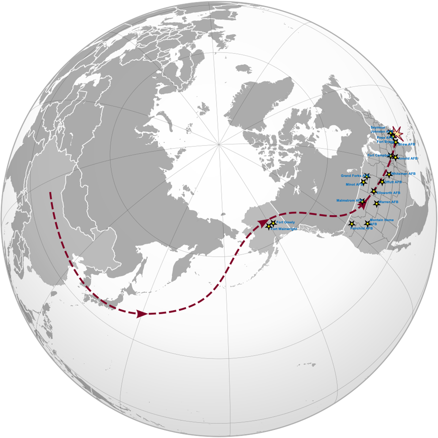 This “weather balloon” happened to skim over the Aleutian Islands, over the massive expanse of interior Alaska, over Fort Wainwright, housing part of the 96-hour deployable U.S. Army Alaska contingent, on past Fort Greely, the key missile defense center of the entire Arctic region, and then across Canada, to somehow wind up strategically on course to fly perfectly over Malmstrom, Ellsworth, and Offutt Air Force Bases in the Great Plains, with a nice window view of Minot and Grand Forks Air Force Bases in North Dakota and Warren Air Force Base in Wyoming.