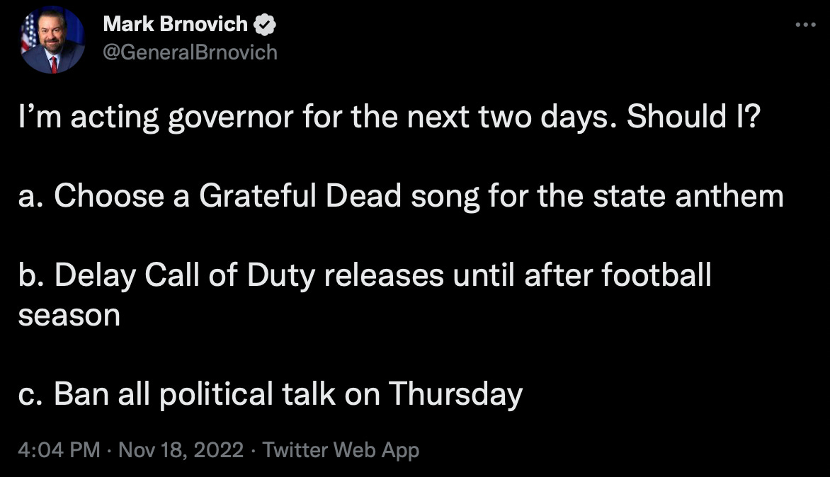 As if these things were not enough, Brnovich took to Twitter yesterday to announce that he is “acting governor” over the weekend. A true statesmen would not put out the type of jackass humor pictured below discussing music and video games in a time of crisis, broadcast from a position of authority. Two-third of Americans believe cheating impacted the midterms, and he is arguably seated right on the belt buckle of all that corruption.