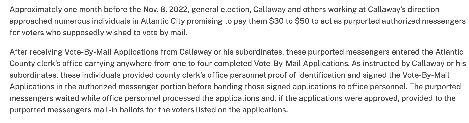 Callaway is typically associated with Democrat candidates (what a surprise!), but has also worked for current Republican congressman Jeff Van Drew, a former Democrat. Another news source claims Callaway is “known for his ability to deliver large blocks of absentee ballots to election officials that often sway the outcome of elections.” So much for our elections being practically fraud-free.