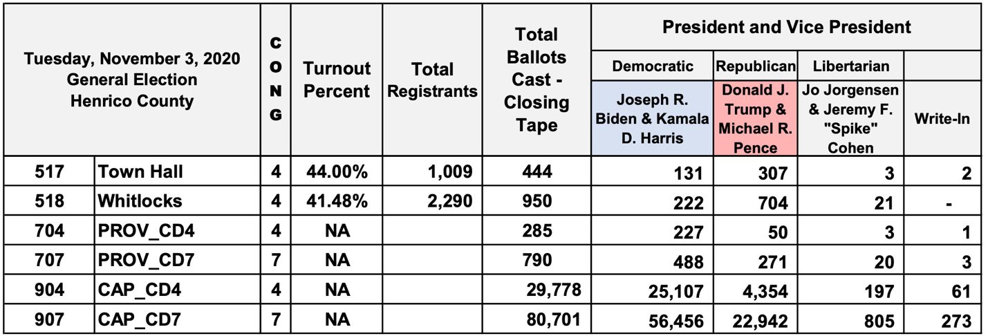 Some gold unearthed by the Precinct Mapping Project and local leader Ken V. for Henrico County, VA, 2020 election results: