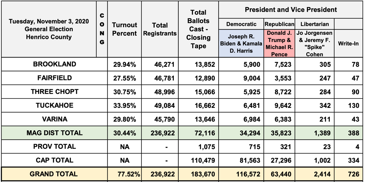 Here are the total votes certified for Henrico County, Virginia, in the presidential quasi-election of 2020: