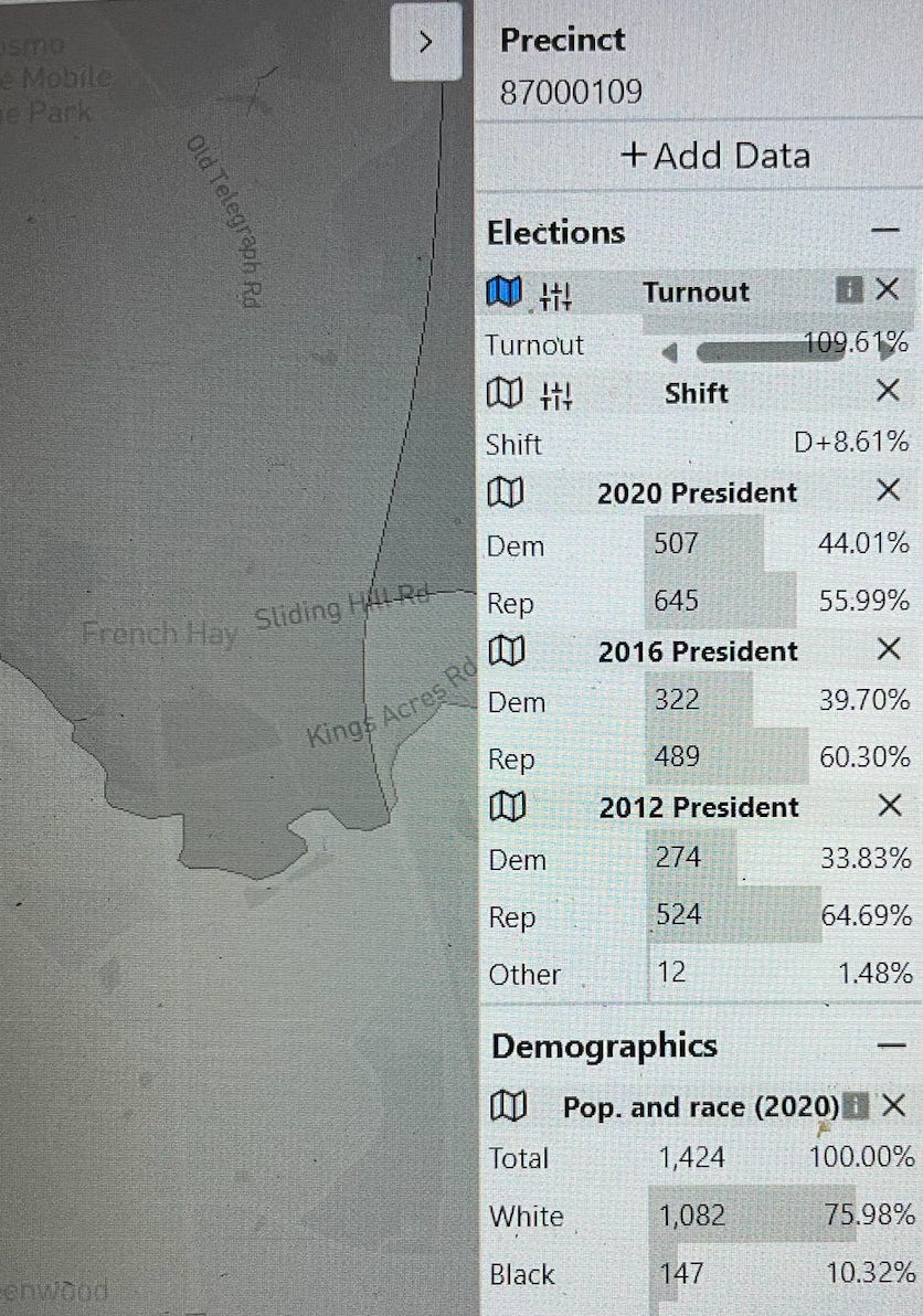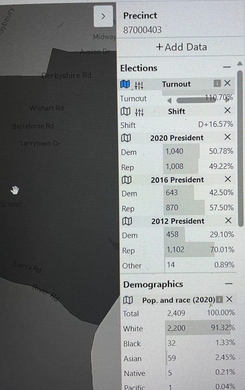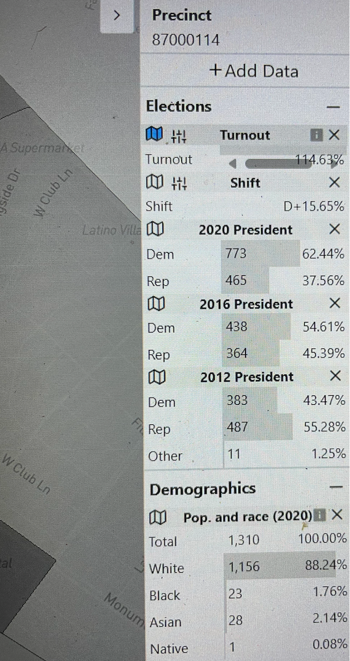 If the screeching left wants to take issue with me, then they should actually take issue with two subscription based research databases – Redistricter and Dave’s Redistricting Atlas. These two databases have been the workaround for counties that conceal absentee data by removing the counts from the precincts in which the supposed voters who cast these ballots are registered to vote (notably, these registrations are recorded in the precinct and used in the county’s own calculation to artificially drive turnout down, when in fact it is sky-high considering all means of balloting).