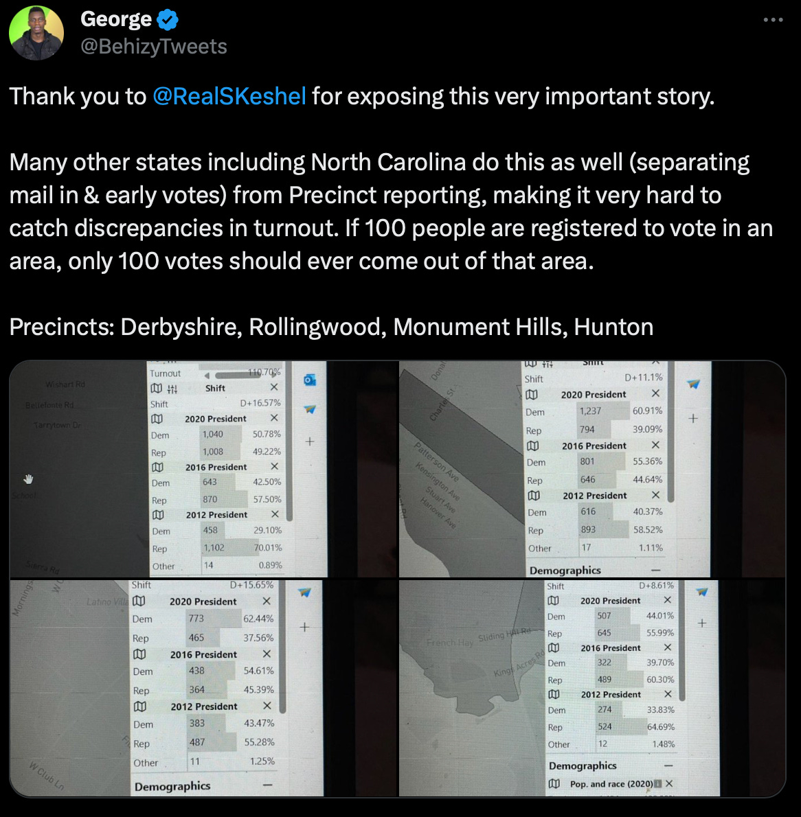 It seems I did make one mistake. I understated the turnout in Monument Hills in my initial post on this subject and in the outrage over truth being revealed, have apparently unearthed a monstrosity I have long suspected was lurking around out there. Counties are concealing precinct data by removing the supposed absentee ballots, one of the main methods of defrauding election returns, from the precinct counts. This is not the case in every state or county, but it is prevalent on the East Coast, and in some red states like North Carolina.