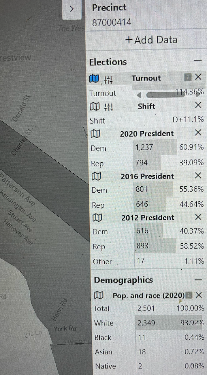 We spend a lot of time talking about obvious things that have serious merit – voter rolls, machines, tabulation equipment, mail balloting, and ballot harvesting. Record keeping is yet another dimension by which voters are being deceived and deprived of due transparency. Imagine an audit of a Fortune 500 company using similar methods to cover up corporate expense abuse, such as the CEO buying vacation homes with company money, or salesmen abusing the expense budget by putting in thousands of dollars in untraceable expenses. There would be hell to pay. These four precincts are not alone in Henrico County – thoroughly disproven, the left will seek to dispute the two databases used to consolidate the missing data that was lodged into an overall bucket for absentee votes for the past two presidential elections, but the truth remains that every vote belongs to a supposed registration – and these registrations are accounted for at the precincts according to Henrico’s own data. Someone has the data of where those ballots came from, and to which voter they belong – and my estimation is that Redistricter and Dave’s Election Atlas have the scent of the trail.