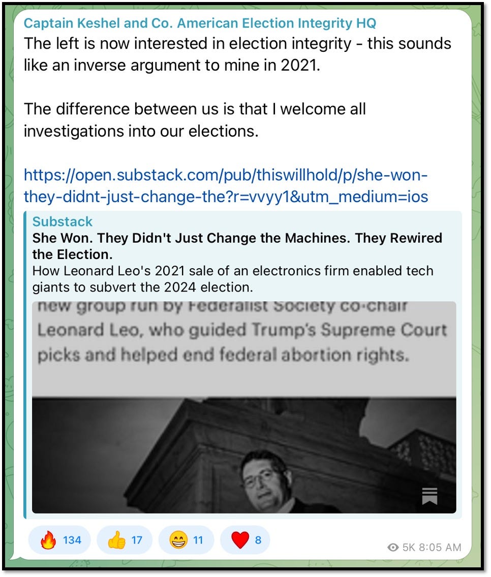 Naturally, supporters of this suit believe they’ve struck gold and that something other than the political persuasion of what is almost certainly another bought-off judge influenced the progress of this case. I posted about this sudden interest in election integrity on Telegram yesterday, and created a Note here on Substack, only to be immediately attacked by the jockey-like author of the puff piece in question for the crime of… supporting all investigations into matters of election integrity.