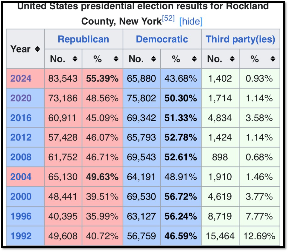 Yes, ladies and gentlemen, out there in the ranks of the left are shadowy imitations of yours truly, putting in the hours in support of a worldview that, if realized, would vanquish the American vision of life, liberty, and the pursuit of happiness, making us completely like the rest of the drowning world. Since we’ve been summoned for another election integrity party, why don’t we see if Ms. Friesdat is on the money or not. Are the presidential results for the 2024 election in Rockland County, New York, highly unlikely?