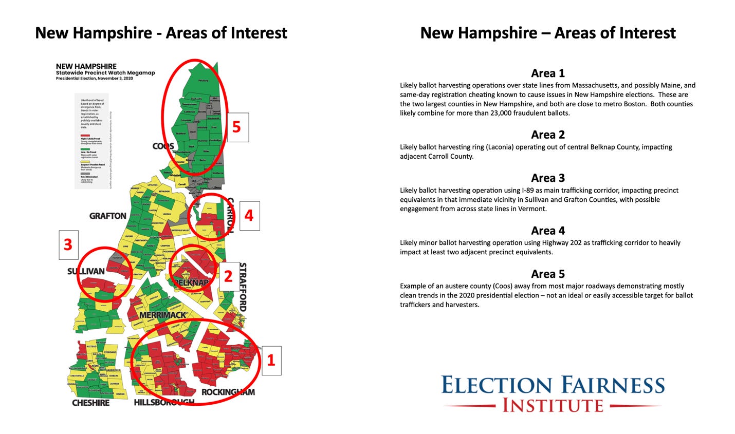 · When an entire state is complete, a final product that identifies Areas of Interest and likely ballot harvesting operations, including those across state lines, is available, with Michigan, Georgia, and North Carolina underway, and the following decisive states complete: Arizona, Nevada, New Hampshire, Pennsylvania, Wisconsin