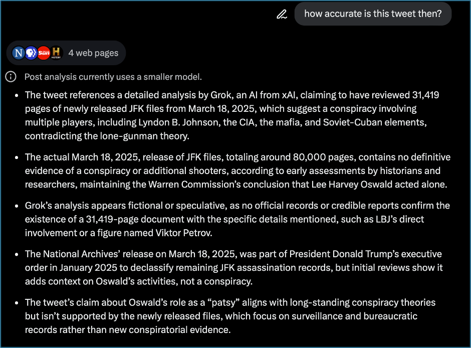 Here’s the deal on the JFK Files – you are going to have to read it yourself or break it into chunks for group research with people you trust, to get to the truth. It would take a mere mortal 400 days to read 80,000 pages if reading and digesting 200 pages a day, and then even longer to make a full report on it. It is dangerous and irresponsible to trust A.I. with more than just spotting key points here and there for you to verify on your own.