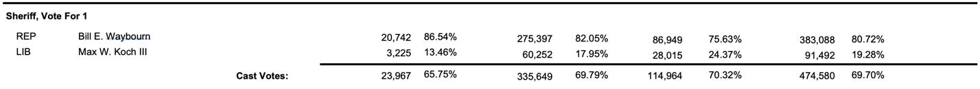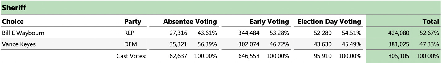 Sheriff Waybourn got past the Democrat by 5.3%. That is only a trend of 56.2% to the left. The Sheriff also has the misfortune of being up for re-election in 2024, when Texas will be a serious prize for fraudsters and for extending the annoying national narrative that Texas is trending into play. He may not realize that one of the key goals of leftists the world over is to neuter law enforcement in major metros and allow crime to run rampant to further their goals of exercising more and more control over the daily lives of citizens. His winning margin in 2020 is nearly seven points left of the straight ticket Republican vote from 2016 (straight ticket voting is no longer available in Texas). If the trend in Tarrant County is another seven points left in 2024, as trends often work, Sheriff Waybourn will have a lot more time for trade shows and speaking engagements, for he will no longer be an active lawman in the former Wild West.