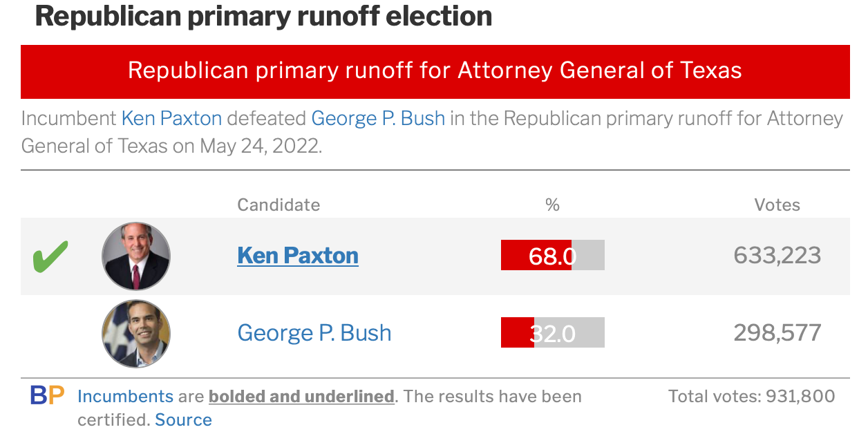 Paxton has been a royal pain in the ass to the Texas Republican machine, which remains deeply influenced by big oil and neocon money, as well as the Bush political dynasty. Americans, including Texans, hate political dynasties, and this fact was well demonstrated when Paxton defeated George P. Bush for the Attorney General nomination in 2022 in a blowout exceeding a 2:1 margin, then went on to win a third consecutive term in the General Election against standard Democrat fodder.