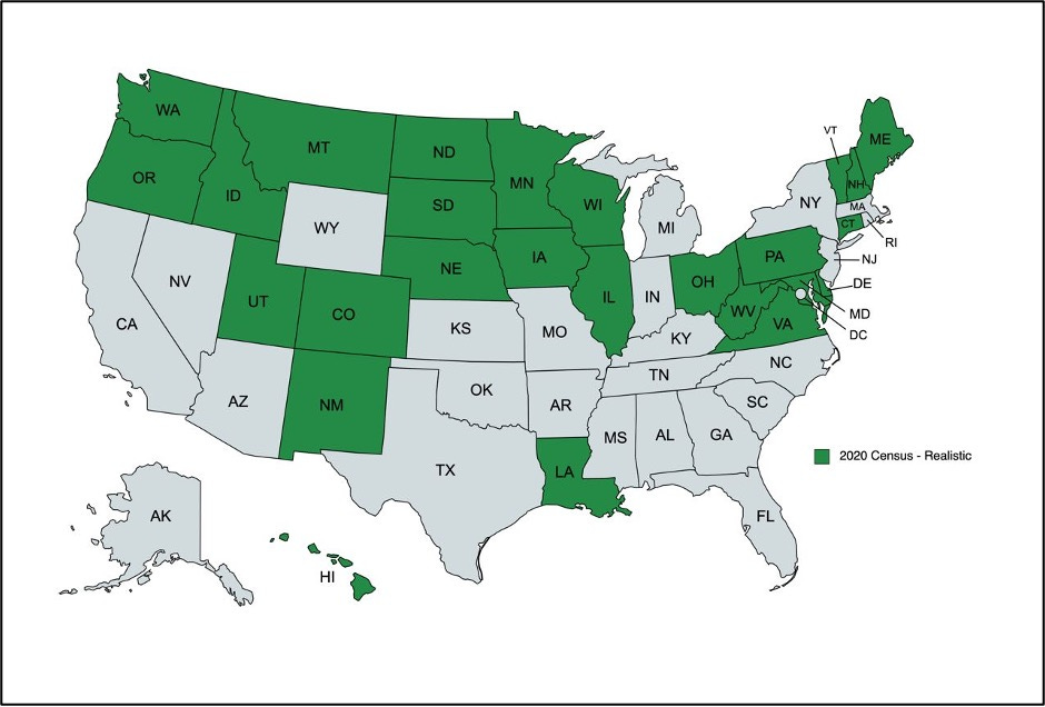 These states shaded in green appear to have normal population data and likely accurate totals (or at least realistic), especially in context of the Census Bureau’s admission of which states they botched the most: