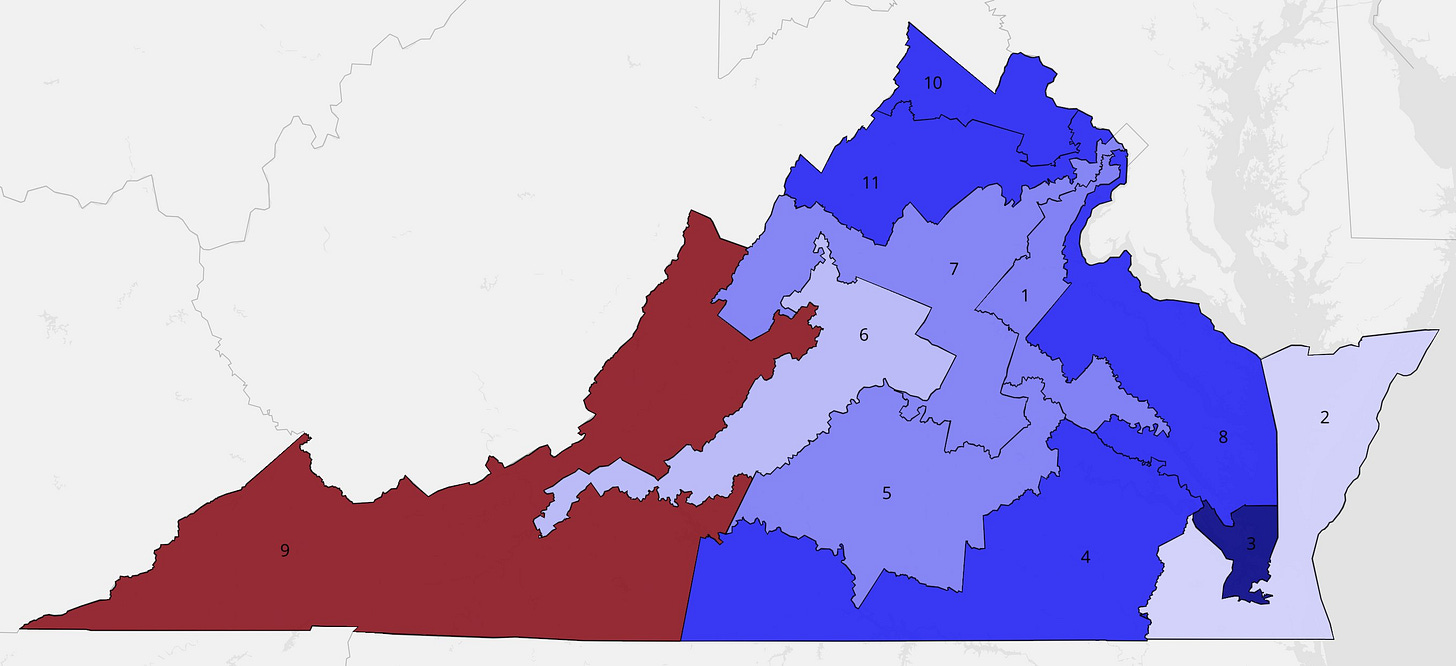 This map, if put into effect, would shift the balance of power in the U.S. House for Virginia’s allocation from 6 to 5 favoring Democrats to 10 to 1. Read Wednesday’s piece for a full overview of how little margin for error there already is for Trump’s Republican Party to hold the line.