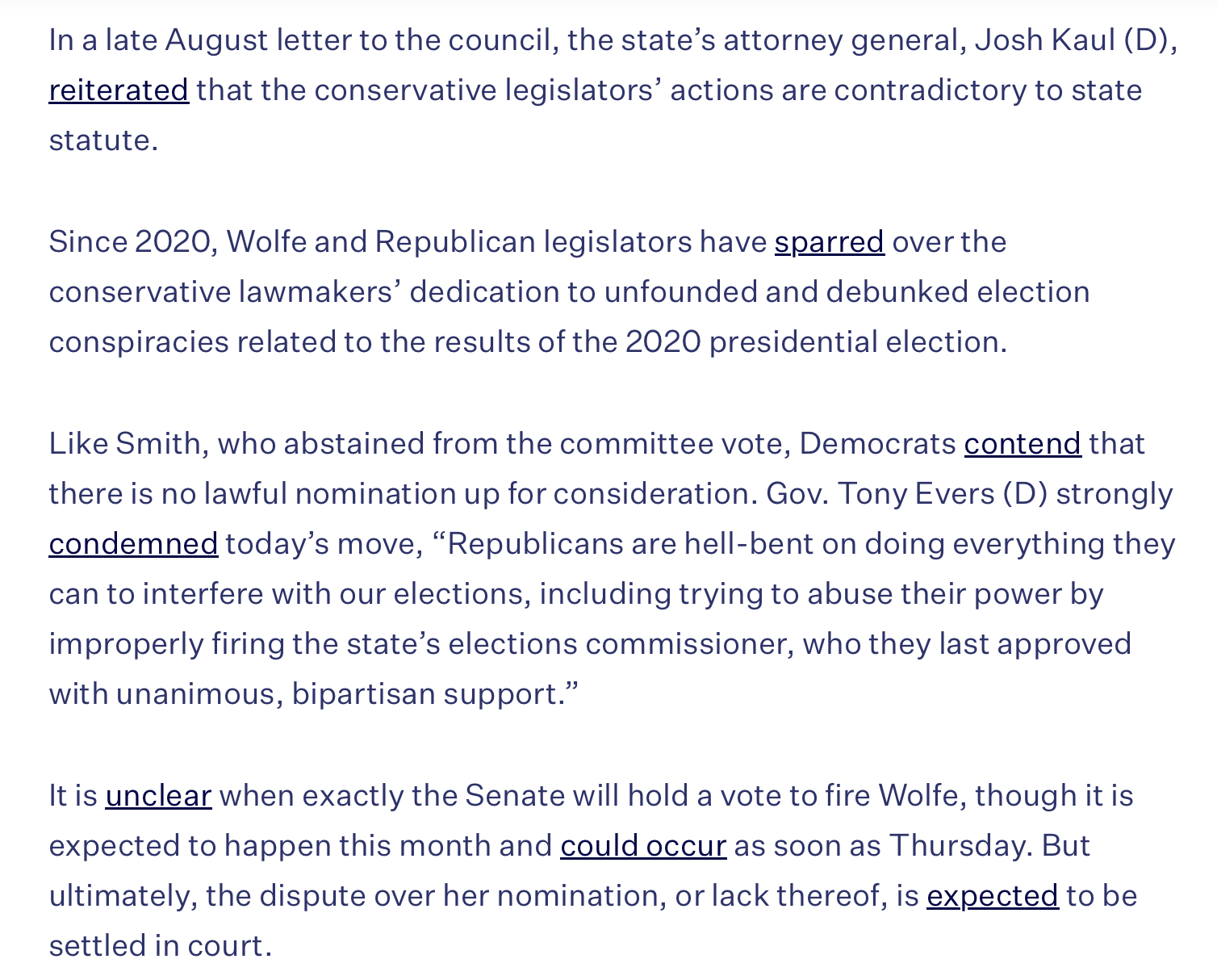 The pressure placed on the Vichy GOP faction in Wisconsin, which only increased after the Gableman investigation wrapped, has not only made it clear that the 2020 election was a farce, but has prompted a surprising move that is perhaps intended to allow the Republican establishment to save face with a grassroots base they can’t win without: they are in the process of unceremoniously canning Meagan Wolfe from her position as administrator of the Wisconsin Elections Commission. A 3-1 vote, recommending her ouster, was moved out of a Senate committee yesterday for an upcoming Senate floor vote.