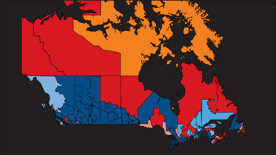 The Liberals lead the “popular vote” by just 2.1%, or just over 400,000 ballots, as of this writing. Keep in mind, when viewing the map below, that red doesn’t equate to the American variant of political map-shading red, which would symbolize non-leftist victory for Republicans. Carney’s Liberals are shaded in Red, and Conservatives are shown in blue.