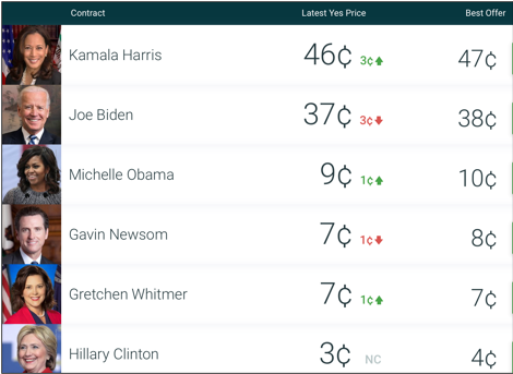 Of note, this author placed thousands of dollars on Trump in the Rust Belt last cycle on PredictIt with very juicy odds in my favor, only to lose it to the system when those states were stolen. Sites like this are prone to groupthink and lemminglike behavior, but the point is that most people find it unlikely for someone, this late in the game, to replace either Biden or Harris, who both hold the Presidency and Vice Presidency, respectively.