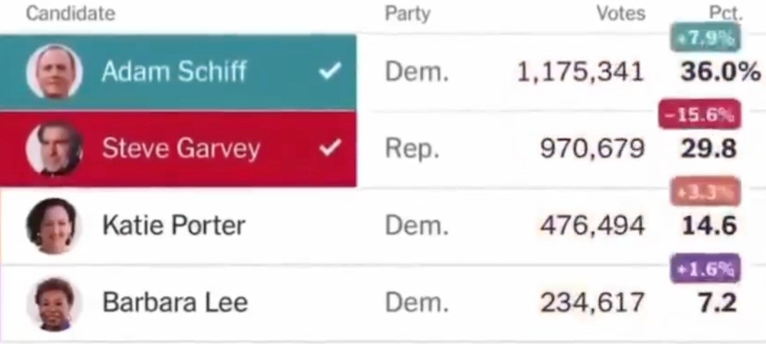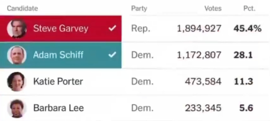 A jungle primary dumps all candidates, regardless of party affiliation, into the race together. Blue states with a weak opposition Republican Party have found jungle primaries as a reliable tool for guaranteeing Democrat vs. Democrat races in General Elections, which has a carry-over effect of depressing Republican turnout for other races that may be more competitive. Genius concept, really, and one that only Democrats have the malice to pull off. Longsuffering California GOPers must have been shocked, then, to find longtime L.A. Dodger hero Steve Garvey, a longshot Senate candidate, polling more than 45% of the vote against his Democrat opponents right up until this happened: