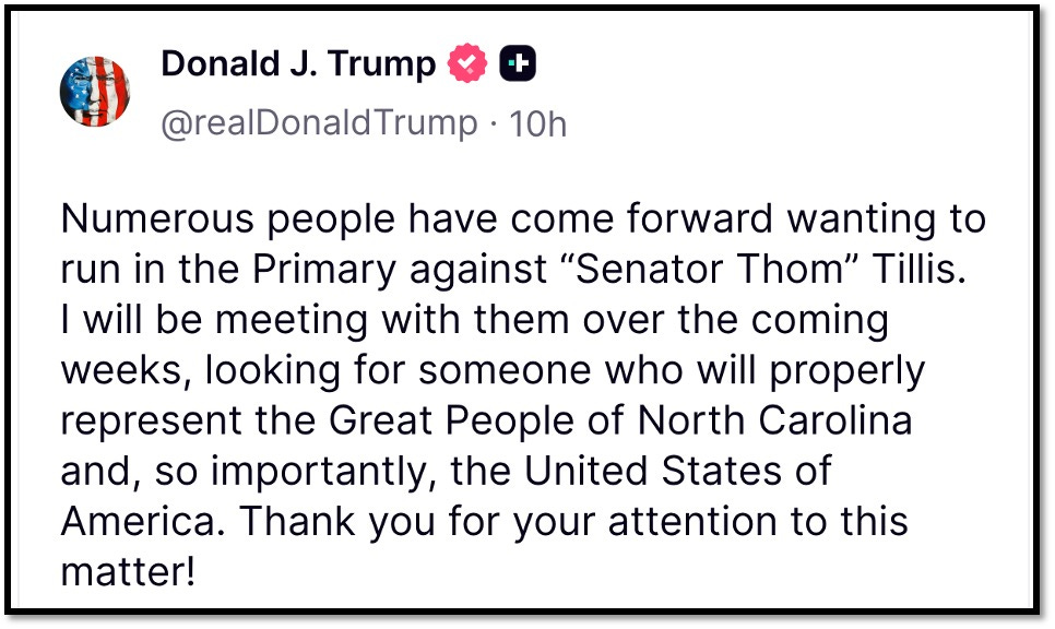 In May, I wrote a feature piece highlighting Thom Tillis’s incompetence as one of North Carolina’s Republican U.S. Senators and correctly asserted that his weakness jeopardizes the GOP majority for 2026 and weakens its power as long as he remains in office. From that article: