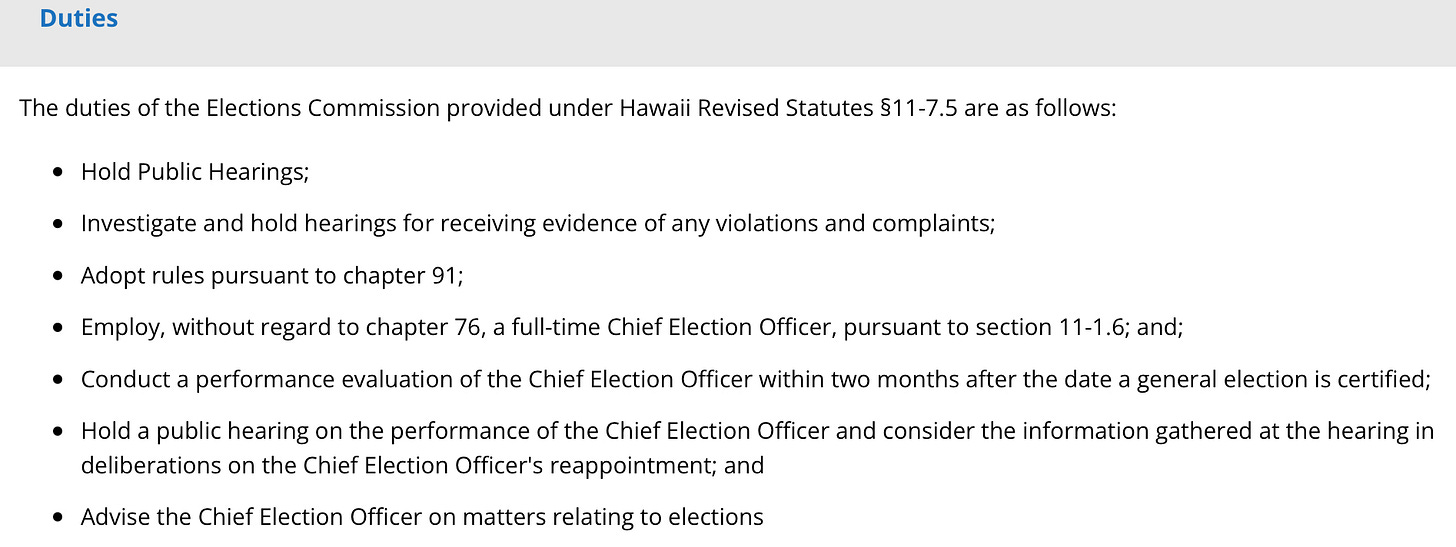 Interesting how Hawaii's system requires a google account to obtain meeting notices (as if google needs any more personal info about people) and also mysteriously has "no data available" about any upcoming election commission meetings [elections.hawaii.gov/about-us/boards-and-commissions/elections-commission/]. Meetings shown have been happening about every other month (FEB, MAR, APR, JUN, AUG, OCT, DEC'24, JAN, MAR'25) but suddenly none for the last three months and nothing scheduled. Yes indeed, "Who is the Conspiracy Theorist Now?"
