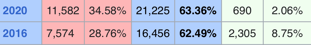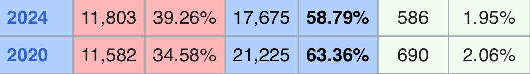 Even accounting for the large 2016 third-party share, Biden’s forecast comes out to 15,000 in 2020 per my modeling thanks to an enormous gain of 52.9% in votes by Trump. He’s 6,225 over that, outperforming the Hawaiian Barack Obama for raw votes in the face of a massive gain by his opponent. If my forecast would have matched official results, Biden would have still won the county by 16.2%; now, let’s introduce the 2024 result: