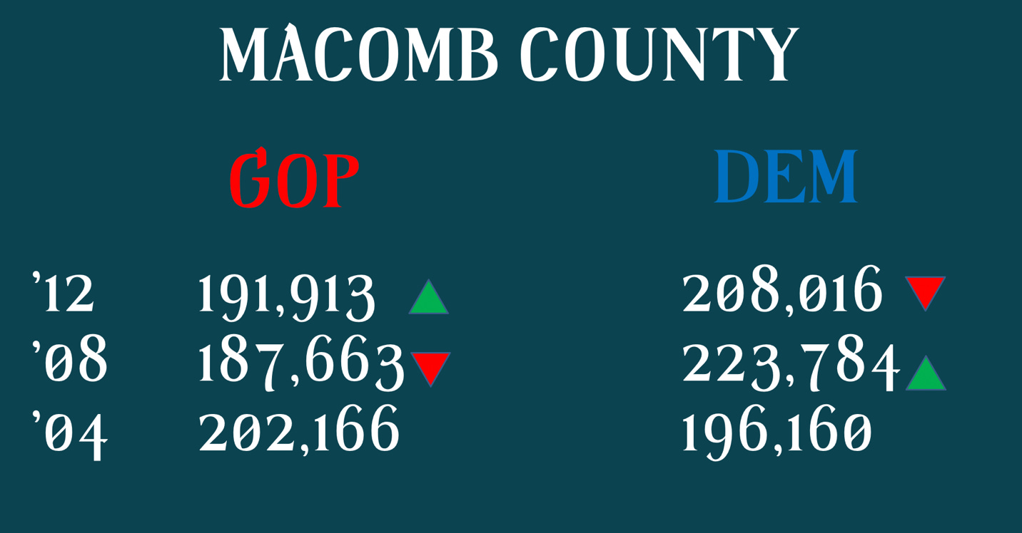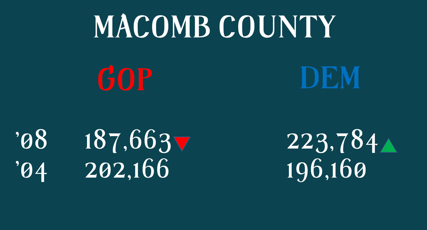 You can see George W. Bush carried the county narrowly in 2004, when he ran well in Michigan, despite a close loss. Barack Obama, with the tailwind of eight Republican years behind him, flipped the county, and did so in dramatic fashion, winning by over 36,000 votes. He captured the union voters, soft suburban voters, and a record share, with record turnout, of minority voters.