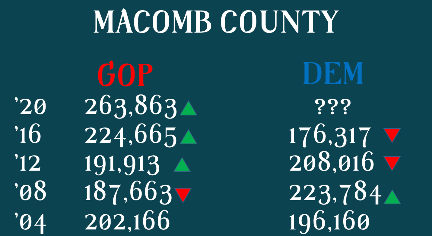 In 2020, Donald Trump’s gains with Cubans and Venezuelans in Miami-Dade County crushed any hopes the Democrats had for stealing the Sunshine State. I constantly remind people that Donald Trump was elected by two-time Obama voters in the Midwest who crossed party lines, unexpectedly, and voted for the economic nationalist candidate. Let me demonstrate a coalition shift for you, using Macomb County, Michigan, the home of the “Reagan Democrat,” as the example.