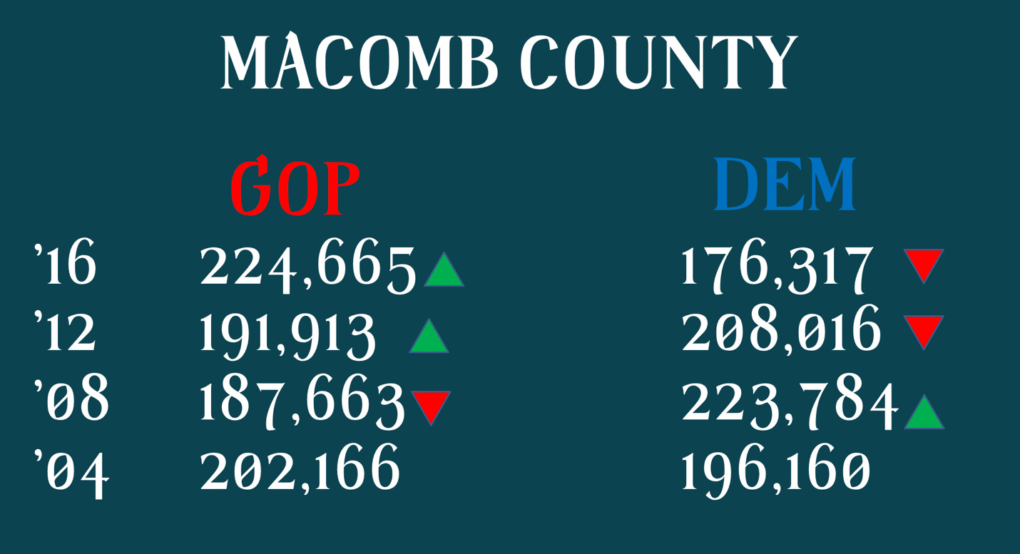 The beauty of the coalition shift is observed below. Keep in mind, the most recent census reports Macomb County grew by just 40,000 in the past ten years, a growth rate of 4.8 percent. That is not a surge, by any means, and when a coalition shift is underway, the changes can be dramatic. This is why Donald Trump won the county by 48,000 votes, just four years after Mitt Romney lost it by 16,000. Trump pulled the working class voters, in a county with a largely stagnant population, away from the Democrats. They lost 32,000, and he gained 33,000 over Romney’s total.