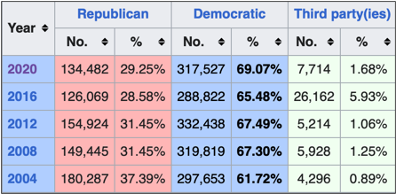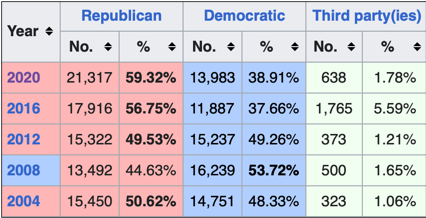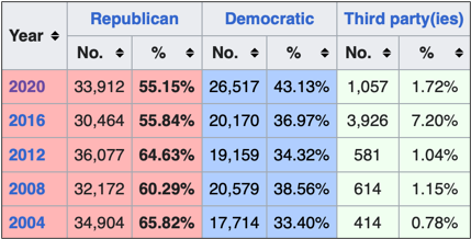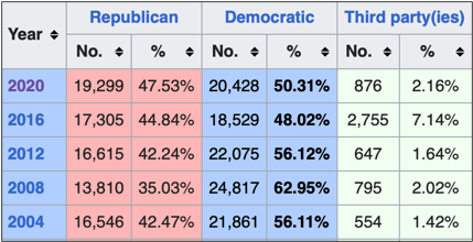 Thanks to decreased turnout and a large third party vote share in 2016, Trump lost more than 11 percent margin of victory from Romney in 2012, and then almost 7 more points in 2020 with Biden making a gain up to 26,517 ballots, with little Trump growth, showing a clear trend away from the GOP.