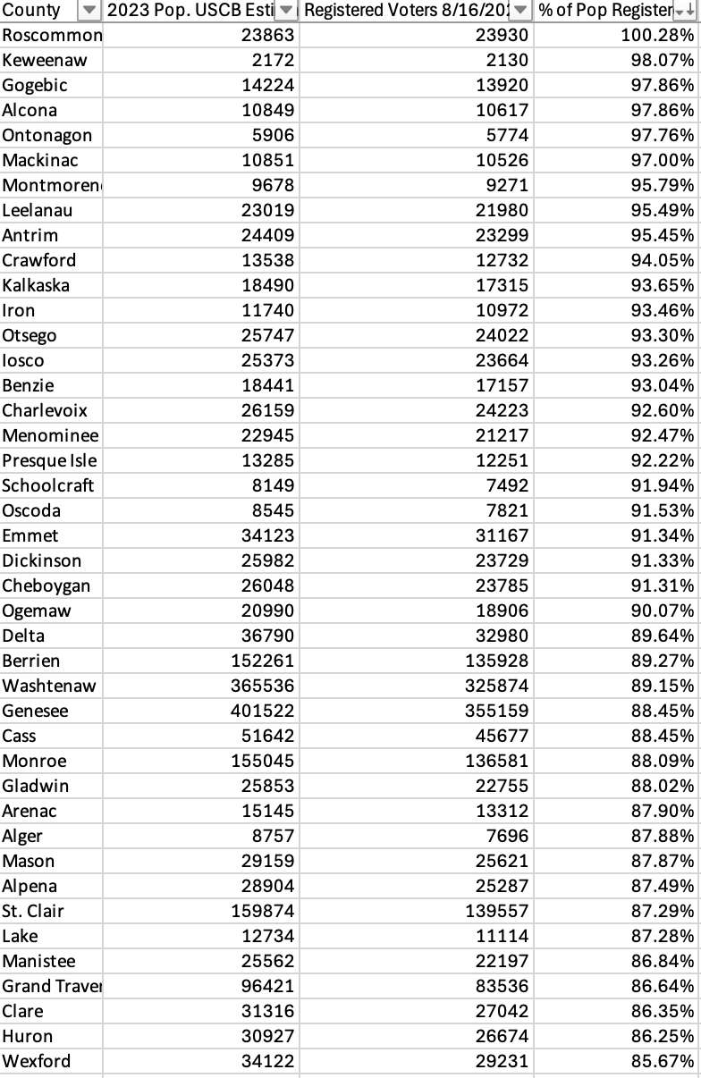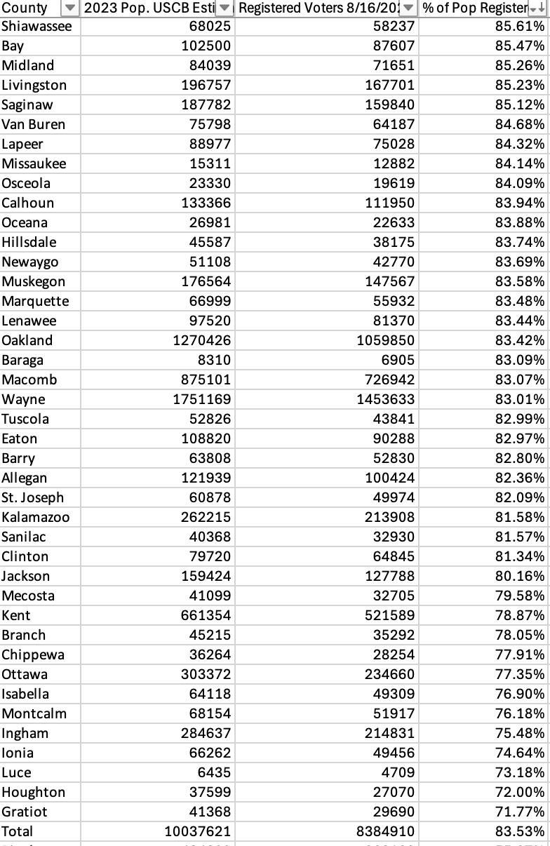 Michigan claims 8,384,910 registered voters with a population of 10,037,621 using the U.S. Census Bureau’s 2023 estimates. Go ahead and visit the links yourself if you’re reading this from the perspective of critic.