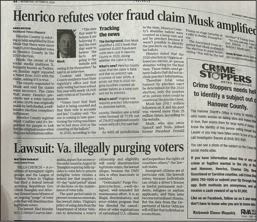 Your local propaganda rag, the Richmond Times Dispatch, and their propagandist, Anna Bryson, characterizes me in the attached snapshot as "a well-known election conspiracy influencer." In reality, I would prefer to move on from this realm of dealing with defensive government employees who repeatedly mock the citizens who pay their salaries for rightly being in an uproar over the state of elections in this country, like suffering under the rapid changing of election procedures to manipulate a presidential race, but I feel a compelling need to make these points as clearly as possible. To be clear, I don't believe the Republican incumbent would have won Virginia in a fair election, but to believe a 10 point margin with a gain of nearly 200,000 Trump votes is in order is to be certifiably delusional.