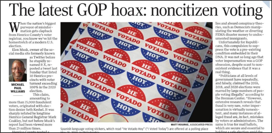First, from the October 9 edition of the paper, written by professional propagandist Anna Bryson, classifying me as Seth Keshel, a well-known election conspiracy influencer. In this piece, she touts the defensive maneuvering of county registrar Mark Coakley without seeking input from the person supposedly being debunked (me):