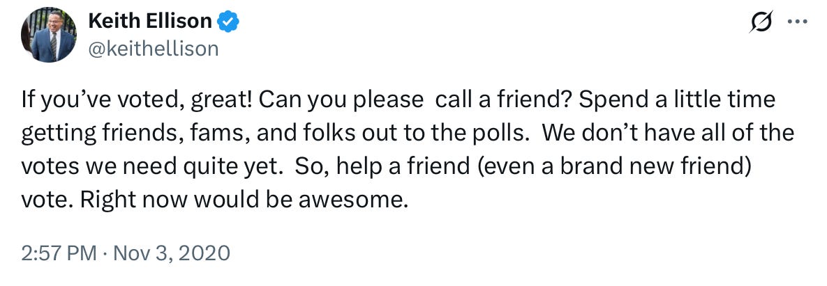 Where there’s smoke, there’s also fire. Internal numbers minus the ballot trafficking done by Minnesota’s friendly Somali community and other leftist organizations must have suggested a potentially winnable race for Trump - which my numbers did as well. Here’s a sliver of gold that made it into my forthcoming book, The American War on Election Corruption, by Attorney General Keith Ellison, unfurled on Twitter just hours before polls closed, begging for every last Democrat vote to hold a state that never votes Republican: