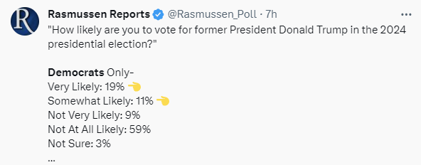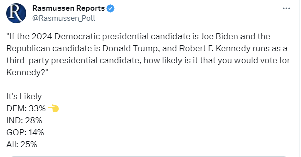 Rasmussen reported 33% of Democrats would be likely to vote for Kennedy, along with 28% of independents. Most importantly, just 14% of Republicans would be likely to do so, which is only about 6% more than the percentage of party defectors in any given presidential election.