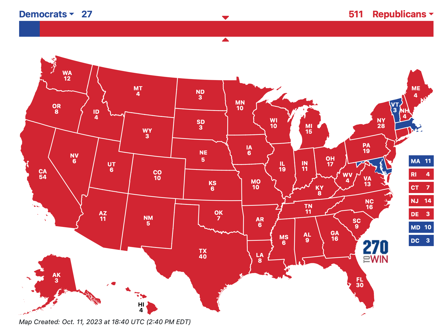 By now, you should know why Newsweek wrote a panic piece about a RFK candidacy a week before the news broke. If Rasmussen is correct that a disparate number of partisan defectors comes from the Democrat, not Republican, camp, as I have surmised, and that 19% of Democrats are likely to vote for Trump (and it could be much worse if that number is the rumored 30%), then Trump wins by tens of millions of votes, and would produce a map like this: