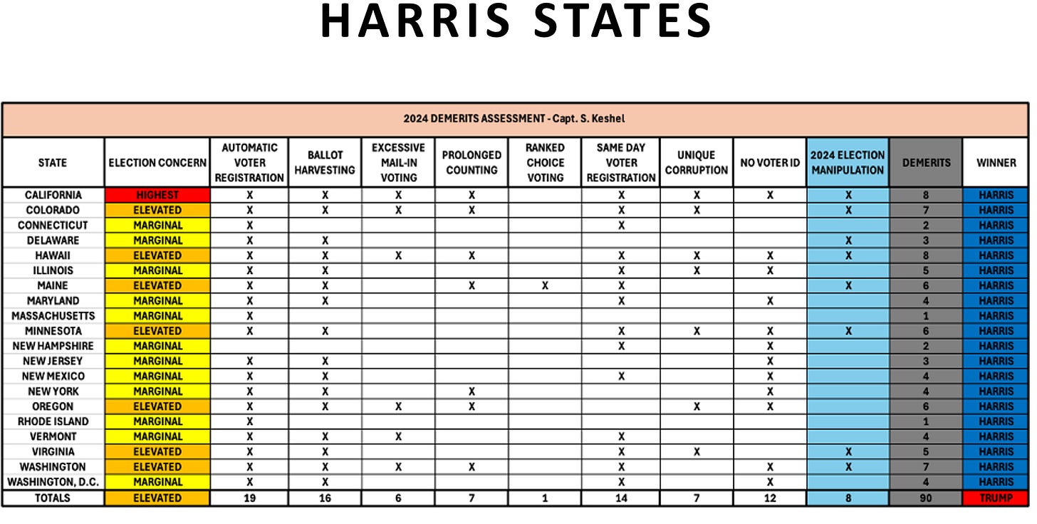 This should really come as no surprise to anyone. The blue wall states are blue because of laws they have on the books. Of my “eight cardinal sins” of election administration, in addition to election manipulation present (or likely) in 2024, the average blue state has 4.5 demerits.