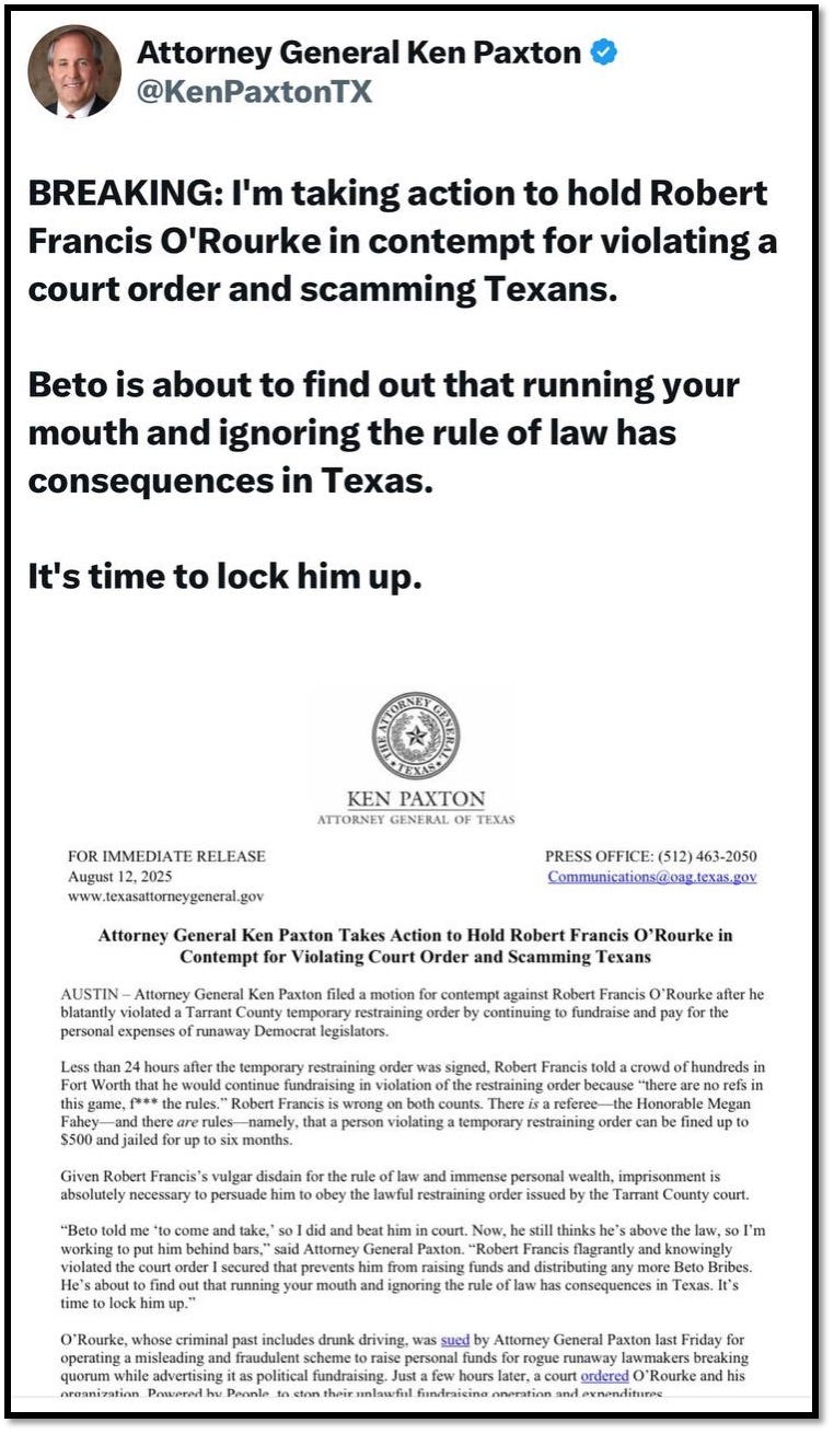 · Attorney General’s successful suit against primary financier Robert F. “Beto” O’Rourke and pending contempt charges tied to that suit: