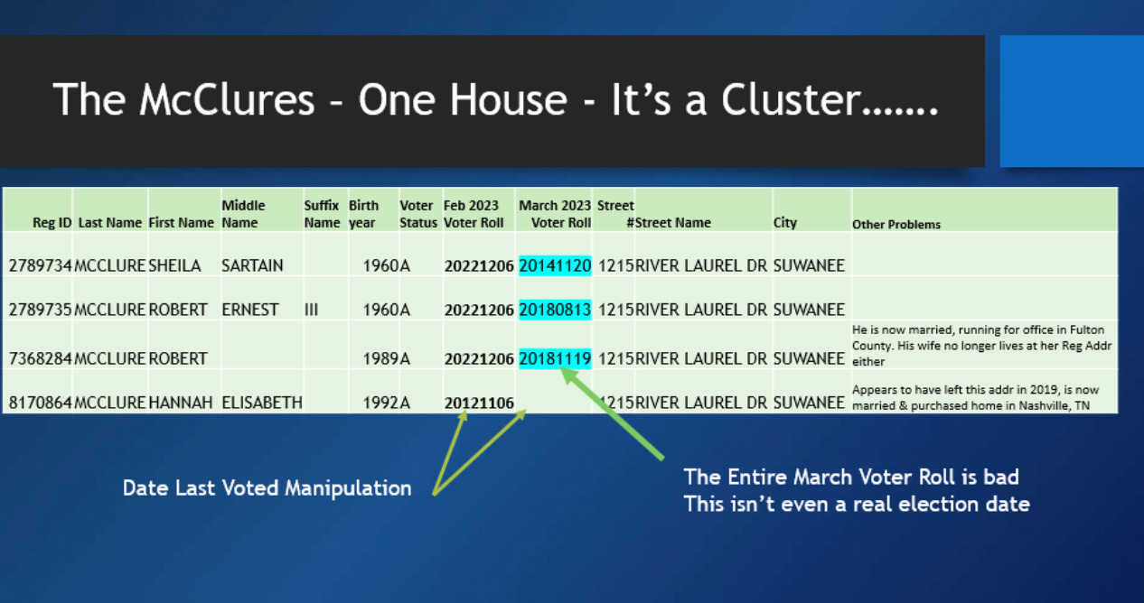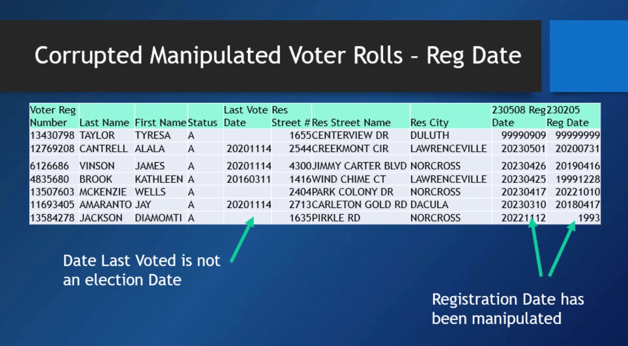 Brooks’ team has found Georgia officials toggling voters from inactive to active, and back to inactive status in order to cast extra votes, and altering “date last voted” to cover up the malfeasance.