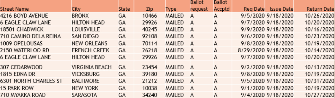Ballot requests came from everywhere – Bronx, San Diego, New Orleans, Virginia Beach, and New York – apparently previously unknown cities in Georgia once thought to be major cities of other states (see graphic below).