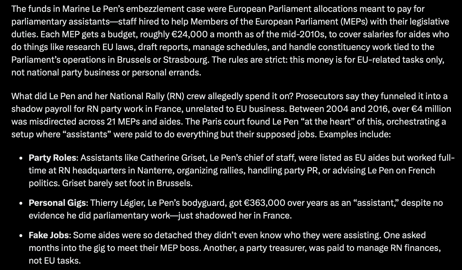 The embezzlement investigation itself began a decade ago, in 2015, and has come to fruition just in time to save the asses of the hardline French bureaucrats who wish to keep the nation drowning in replacement immigration strategies, crippling debt, and other policies inconsistent with national success or preservation of sovereignty (which has arguably been ceded to the E.U., anyway). In summary, the courts determined that Le Pen and company used E.U. funds on partisan staff expenses rather than authorized expenses.