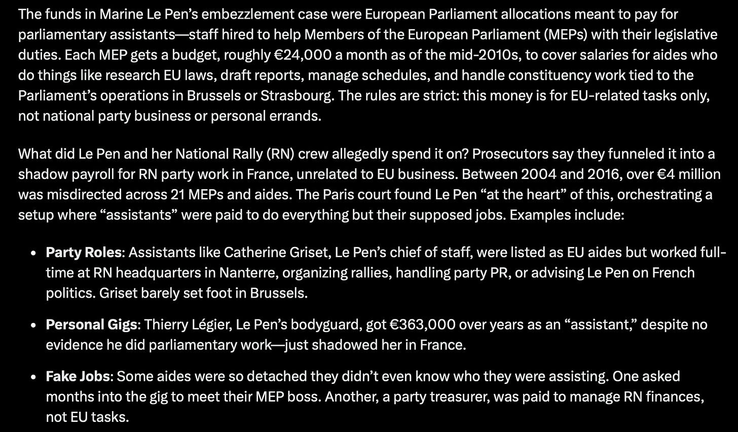 Are Le Pen and company truly guilty of the allegations? I can’t speak for them, and I don’t know. What I will say is that her European allies are screaming bloody murder and this decision is conveniently timed to allow a very small window for appeal and potential overturning for someone who has gradually improved in each of her three presidential runs as the world burns.