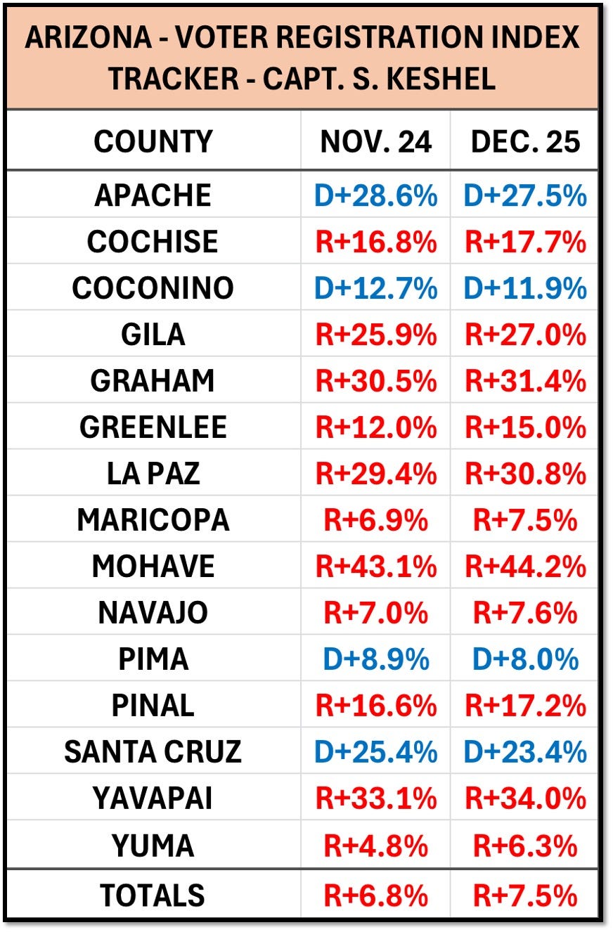 Arizona is almost a full 33,000 net registrations more Republican than it was in 2024, when Trump won the state by 5.5% - not by enough to get Kari Lake across the mail-in balloting safety net. The Republicans have almost doubled their lead since the 2022 midterms, which you can read about in my piece outlining Katie Hobbs’s grim prognosis for reelection.