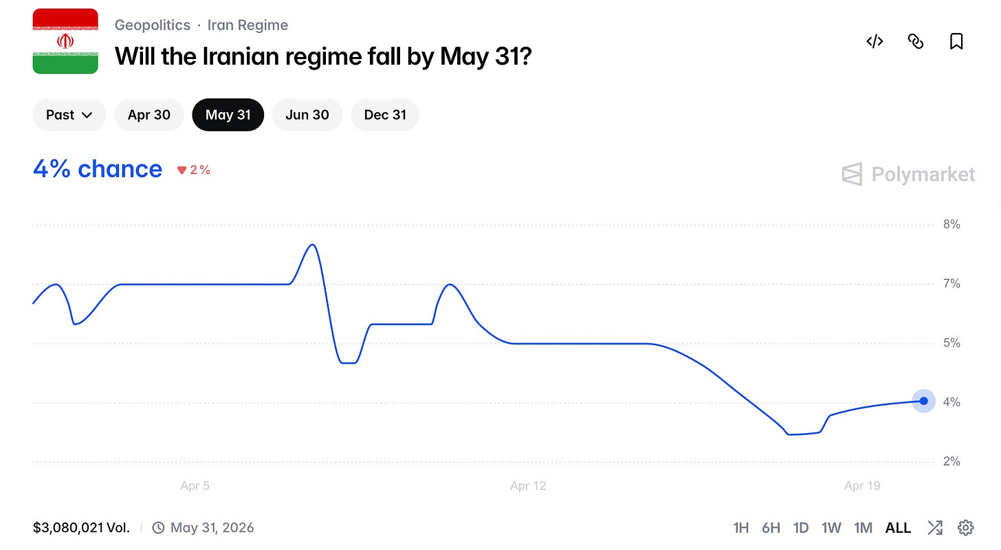 In order to get that, it will require the Iranian people doing the dirty (and bloody) work of eradicating all traces of the regime and preventing the IRGC from holding power, or it will require a lot of American lives lost in conventional ground conflict and the ensuing counterinsurgency operation. The President knows that, and I am confident the second option is no option at all. He also knows that uprooting a regime through air strikes and naval maneuvering isn’t going to happen. Online bettors don’t see the regime completely falling anytime soon, either: