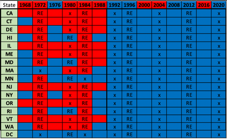 Yes, we expect these states to go “blue” on Election Night, because we have been conditioned to expect those outcomes in Pavlovian form. This is the case, despite decades of history showing most states as politically flexible and with certain tendencies, such as nearly unwavering support for Republican incumbents. The “red wall,” on the other hand, a coalition of 13 states that have all been Republican presidentially since 1980, which today make up an even larger red wall after the later conversions of other mostly Southern states, is made up of states that accurately reflect political dynamics, economic contributing factors, and rural and traditional beliefs with Republican electoral representation.