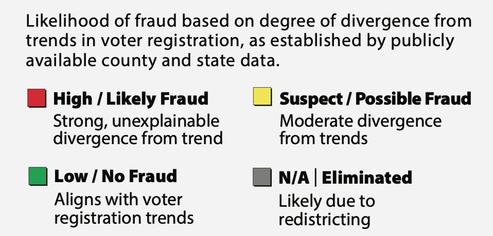 I identified just one precinct – located in Ocean Shores – that rates as high based on my proprietary model predicting the likely number of fraudulently produced ballots. The rest of the precincts feature a smattering of likely excess indications that do not reach my threshold for being colored in red (high). While the county, and therefore the state, totals suggest overwhelming bloating of the vote for the home team (the Democrat Party), it is harder to locate it on paper than it is in a state that divides its counties into fewer precincts, such as Georgia…