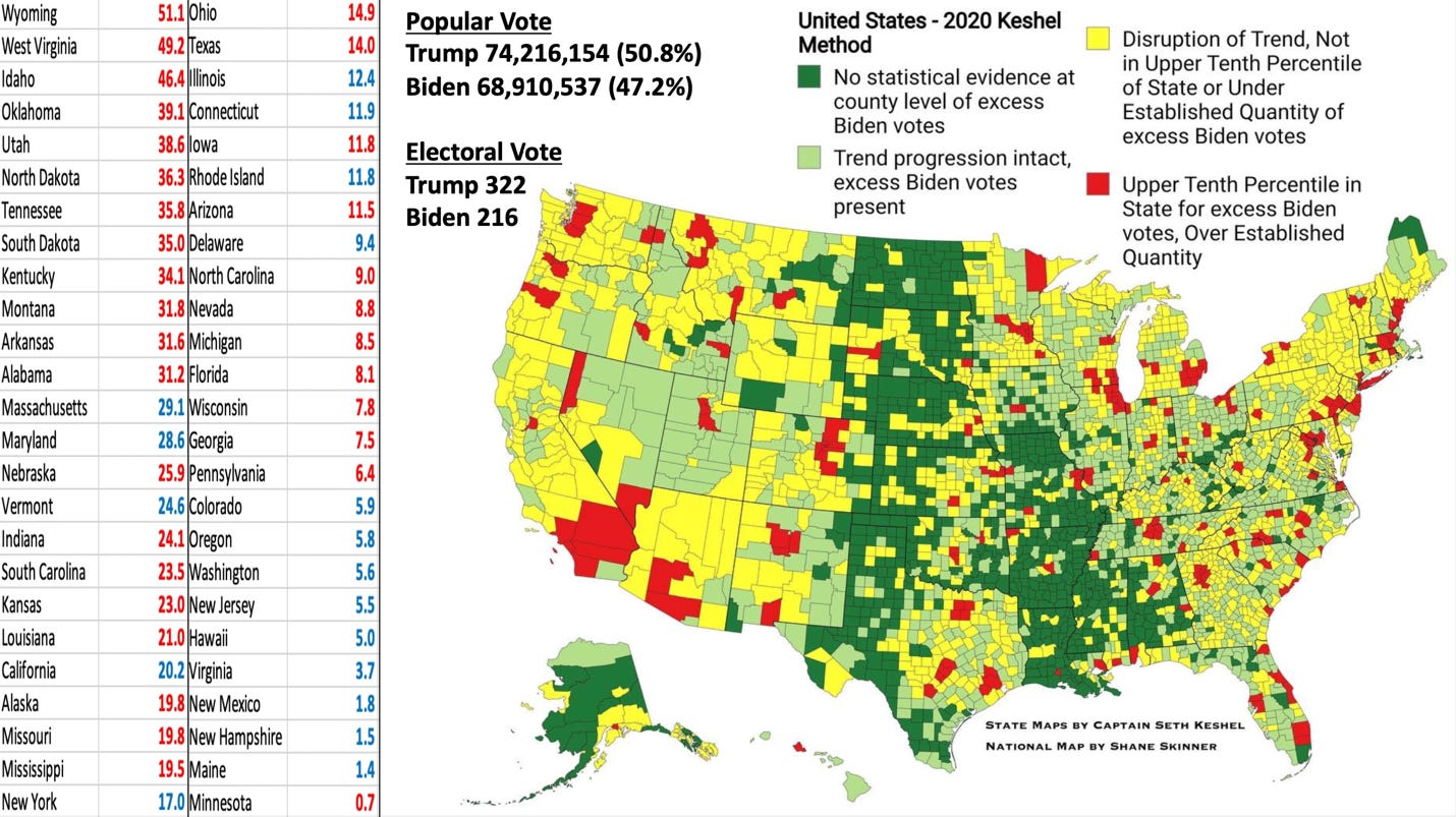 My assessment of the 3,143 county equivalents at the county level (the estimate made from viewing the total of votes prior to scrutinizing precinct data) suggests an Electoral College victory of 322-216 for Trump in an election free of the corrupt practices that ushered in the 46th President, with a popular vote victory of 5.3 million in margin (3.5%). That breaks down into many valuable metrics: